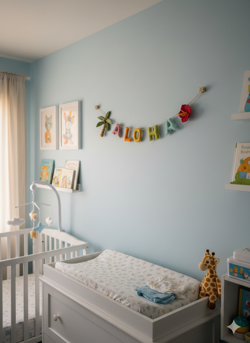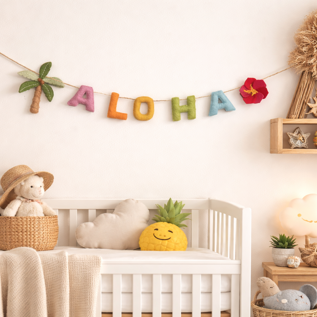 The garland is beautifully accented with a felt palm tree on one end and a vibrant hibiscus flower on the other, adding playful detail and a warm Hawaiian feel. Lightweight and easy to hang, it’s perfect for summer parties, luaus, beach-themed events, nurseries, playrooms, or as a year-round reminder of sunshine and relaxation.