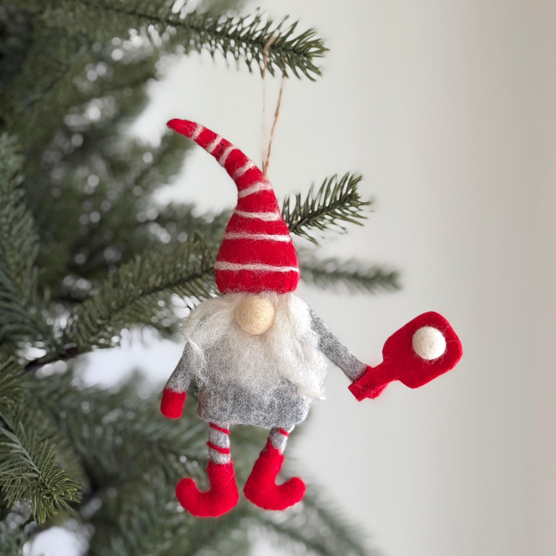 Serve up some holiday cheer with this playful Pickleball Gnome Ornament! Handmade from wool felt, each gnome features a tall red hat (polka dot or striped), cozy grey outfit, and candy cane-striped legs. Clutching a mini paddle and sporting a fluffy white beard, these festive gnomes are ready to rally on your tree.
